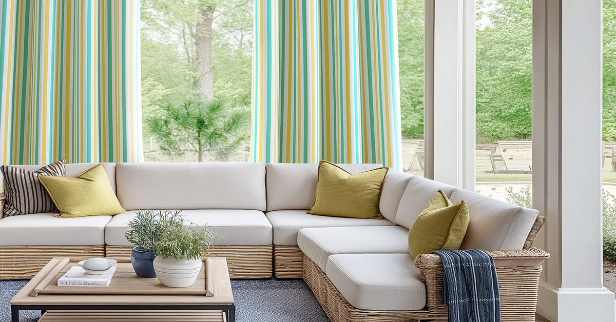- Bring a touch of tropical flair to your outdoor retreat with our Tropical Sunshine curtains from the Villanova Outdoor Collection. These curtains showcase a vibrant striped pattern in teal, yellow, and white, perfect for adding color to your patio, porch, or gazebo. Crafted from robust 200gsm spun polyester, these curtains are built to endure the elements, boasting impressive color fastness and water repellency. Enjoy the blend of aesthetics and durability with our Tropical Sunshine curtains, designed to elevate your outdoor living experience.