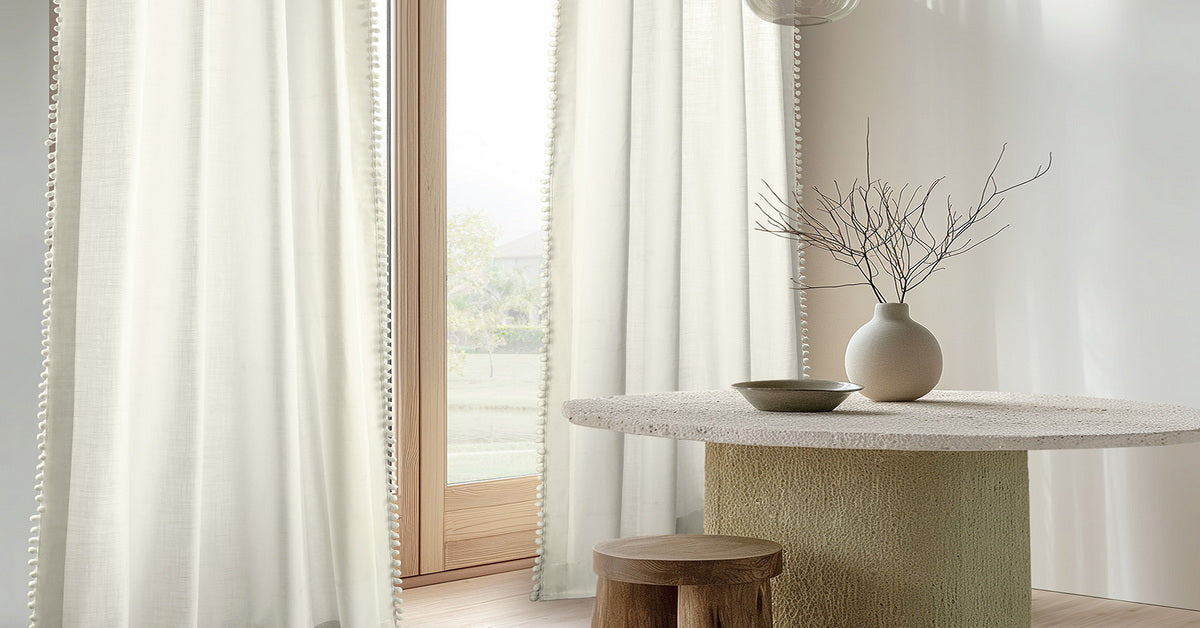 - Channing is basic white elegantly embellished with small white pom-pom ball trim on both sides. This 100% cotton curtain has a refined texture, unlined, and has no backing.