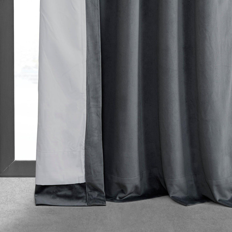 - Distance Blue Grey is a dreamy dark denim blue. This luxurious velvet curtain is lined with off white thermal fabric.