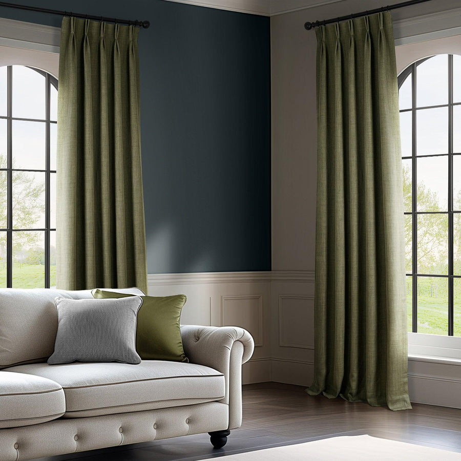 Khaki Green French Pleat Textured Faux Linen Room Darkening Curtain