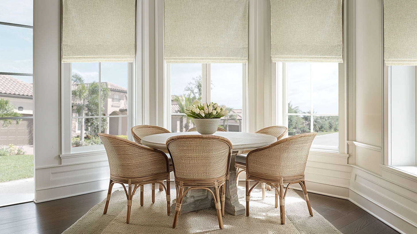 Heavy Faux Linen Roman Shades: Upgrade your windows with our Heavy Faux Linen Roman Shades, made from a luxurious blend of 96% Polyester and 4% Linen. Choose from a wide range of colors including white, cream, beige, and grey to match any decor style. With light filtering properties such as light filtering, room darkening, or blackout, and lining choices such as unlined, lined, lined & interlined, or blackout lined, these shades offer versatility and customization for various rooms in your home. Whether you prefer a soft, diffused glow for your living room or complete darkness for your bedroom, our shades provide the ideal solution to suit your preferences.