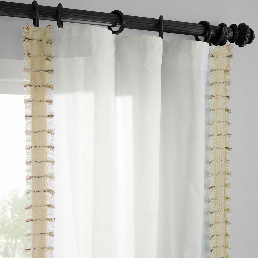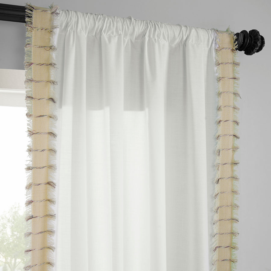 - Melford is basic white and features frind on both sides with multi-color yarns including rust, blue, and green throughout for visual interest and textural excitement. This 100% cotton curtain has a refined texture, unlined, and has no backing
