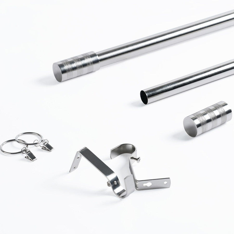 - The modern metal finish of our Nickel Extendable Metal Rod Set dresses up any window for a designer quality look! Our Nickel Extendable Metal Curtain Rod Set comes complete with a telescoping curtain rod, mounting brackets, stylish removable finials, and installation hardware including screws and wall anchors. Our sturdy 1" diameter rods expand from 52" to 144" wide and come with installation instructions.