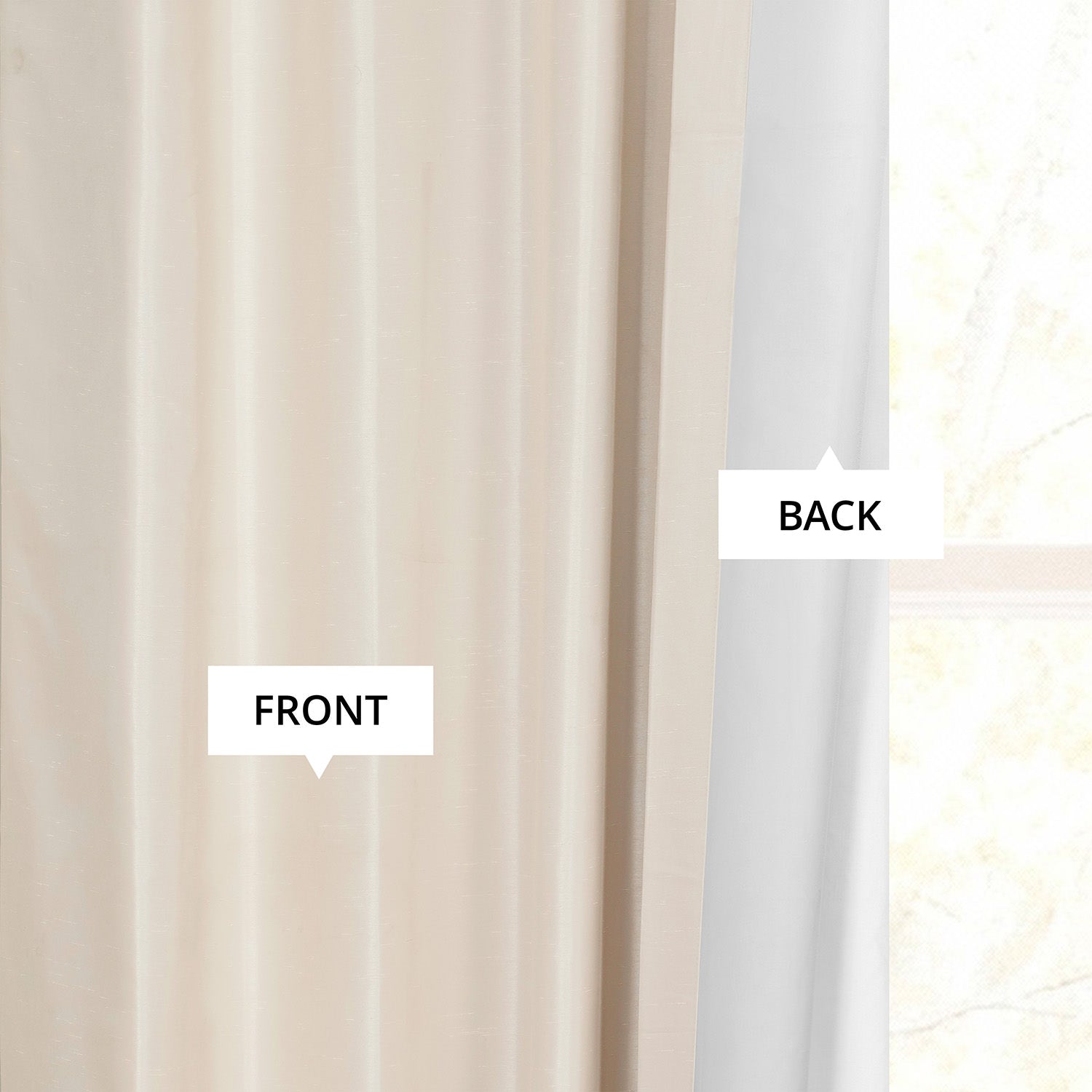 - Vintage off white is a creamy off white with slubs scattered throughout. This iridescent silk-look curtain is lined with off white blackout fabric.