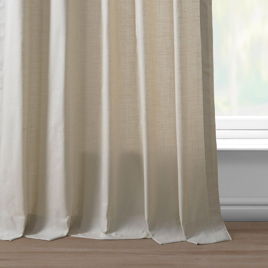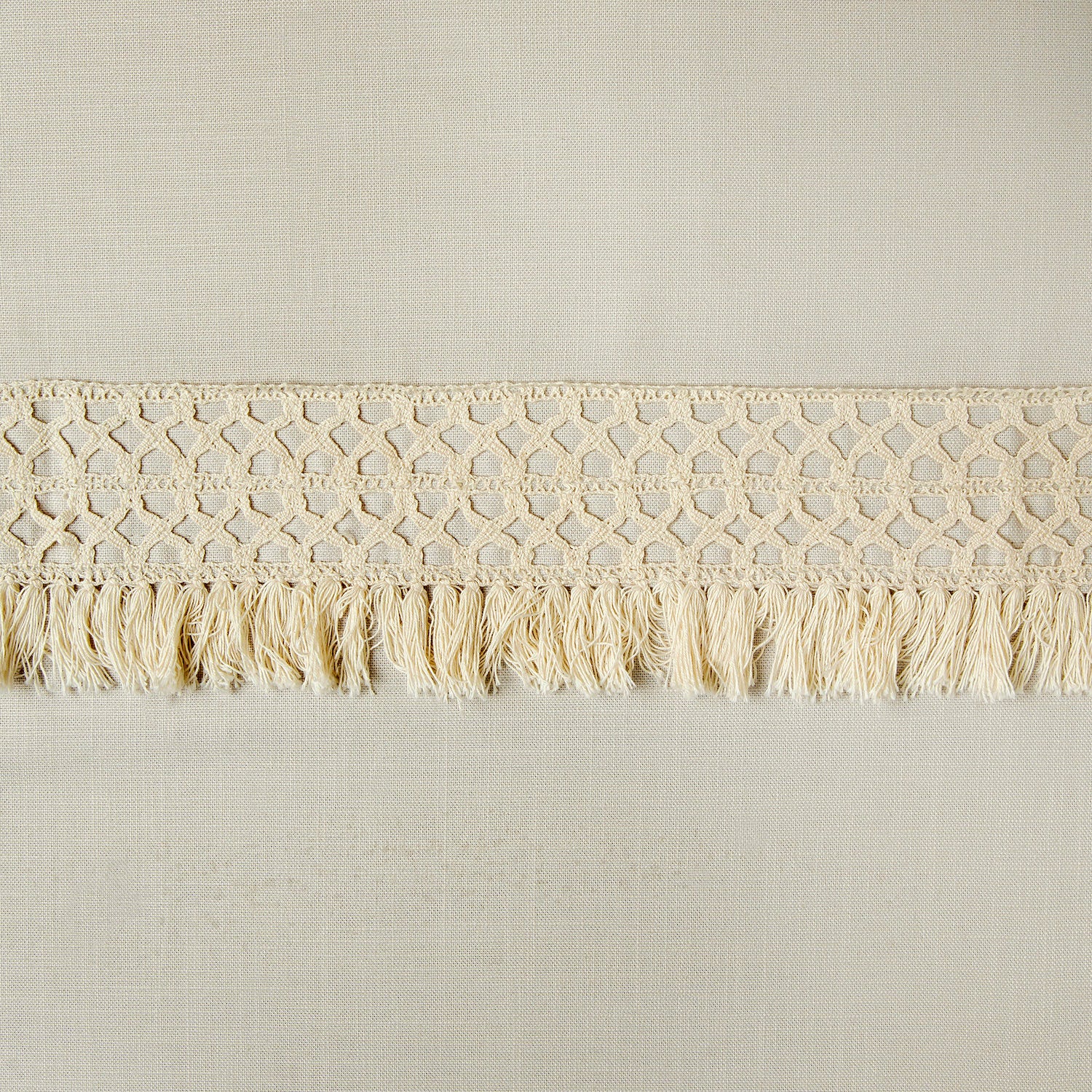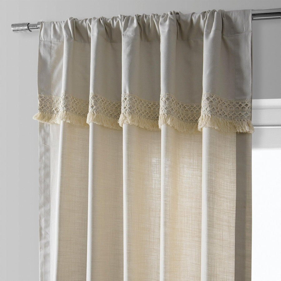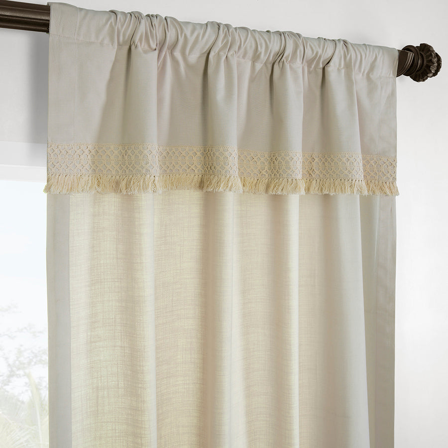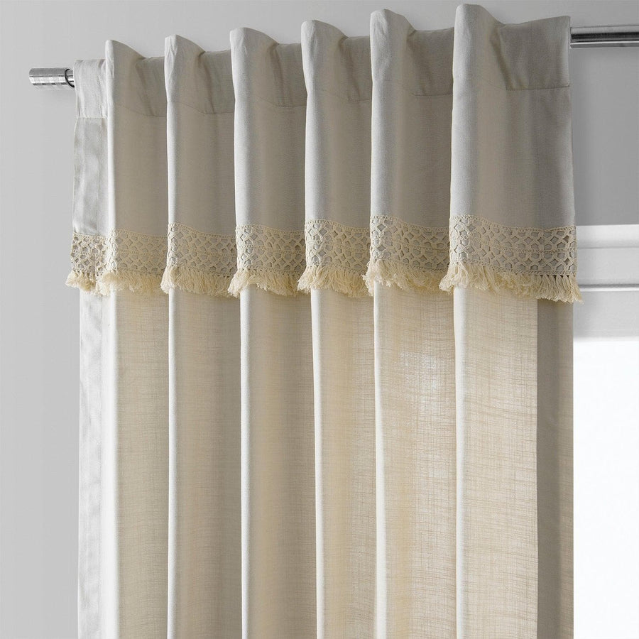 - Sayville is basic beige decorated with lighter beige cotton tassel trim. This 100% cotton curtain has a refined texture, unlined, and has no backing.
