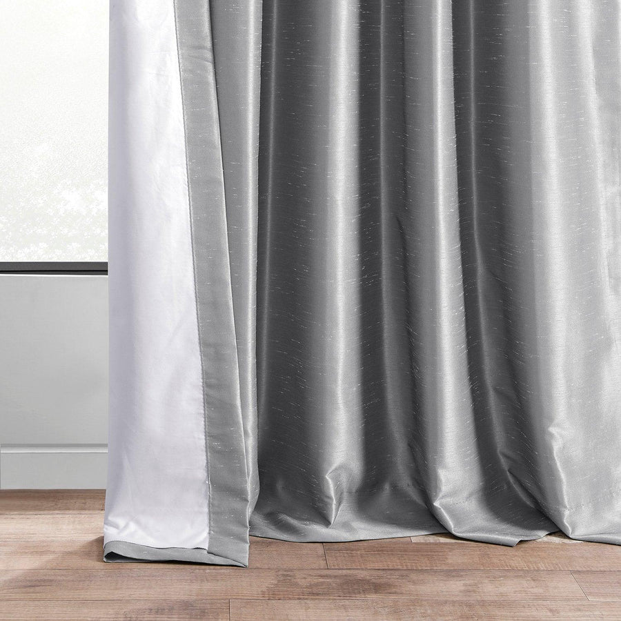 - Vintage Storm Grey is a deep silver grey slubs scattered throughout. This iridescent silk-look curtain is lined with off white blackout fabric.